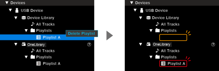 Apagar uma lista de reprodução ou faixa reflete-se apenas na biblioteca para a qual é realizado o controlo. Realize comandos de eliminação nas duas bibliotecas.